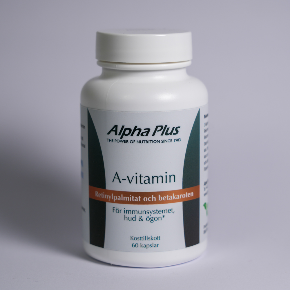 Alpha Plus A-vitamin är ett veganskt kosttillskott i kapselform som innehåller A-vitamin i form av retinylpalmitat samt betakaroten från svamparten Blakeslea trispora. A-vitamin bidrar till immunsystemets normala funktion, bibehållandet av normal hud och synförmåga samt till normal järnomsättning. Förpackningen innehåller 60 kapslar.