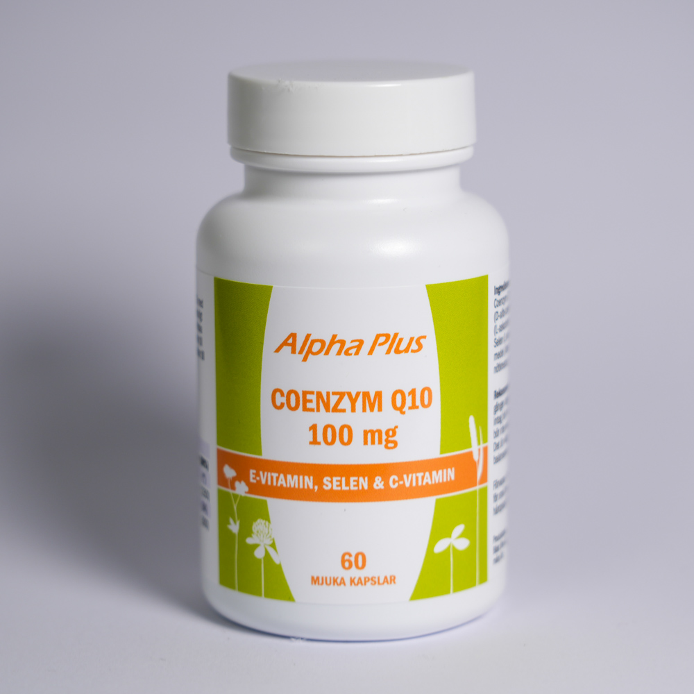 Alpha Plus Coenzym Q10 100 mg är ett kosttillskott i mjuk kapselform som innehåller 100 mg ubikinon (Coenzym Q10) per kapsel. Produkten är berikad med E-vitamin, C-vitamin och selen. E-vitamin och selen bidrar till att skydda cellerna mot oxidativ stress, medan C-vitamin bidrar till att minska trötthet och utmattning.