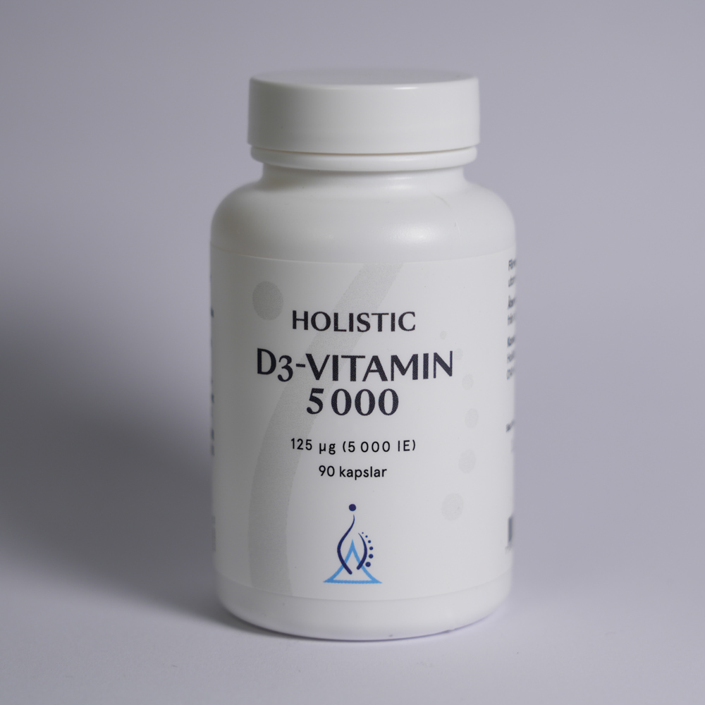 Holistic D3-vitamin 5000 är ett kosttillskott i kapselform som innehåller 125 µg (5 000 IE) vitamin D3 per kapsel. D-vitaminet är upplöst i ekologisk kokosolja för att säkerställa optimalt upptag, då D-vitamin är fettlösligt. Vitamin D bidrar till immunsystemets normala funktion, bibehållandet av normal benstomme och muskelfunktion samt normala kalciumnivåer i blodet.