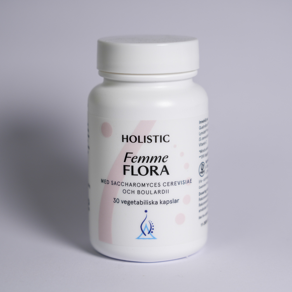 Holistic Femme Flora är ett kosttillskott med 30 vegetabiliska kapslar, utformat för att främja en balanserad mikroflora i både underliv och tarm. Produkten innehåller två jäststammar och är berikad med C-vitamin för att stödja immunförsvaret.