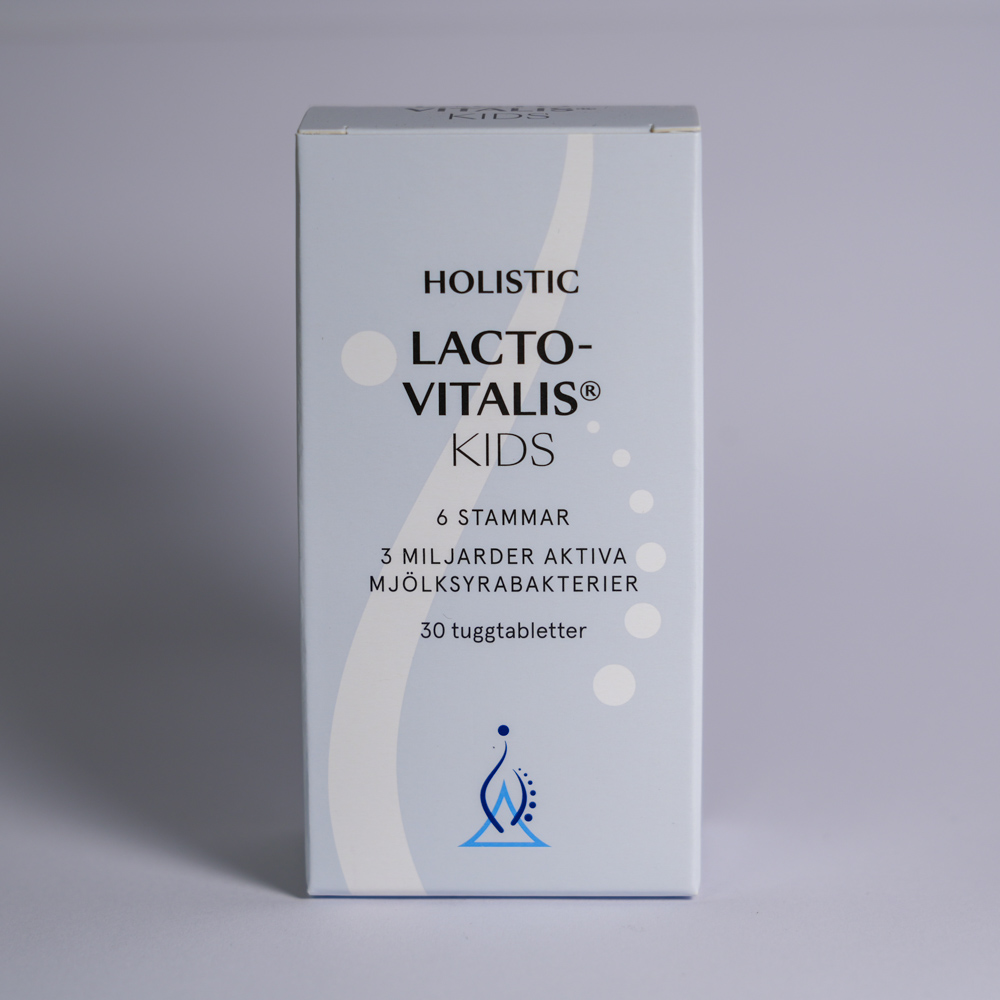 Holistic Lactovitalis® Kids är tuggbara kosttillskott i tabletter med frisk citronsmak, formulerade för att stödja barns tarmflora och immunförsvar. Varje tablett innehåller minst 3 miljarder CFU levande mjölksyrabakterier från 6 olika stammar, tillsammans med prebiotiskt FOS och 12 mg vitamin C. Förpackningen innehåller 30 tabletter.
