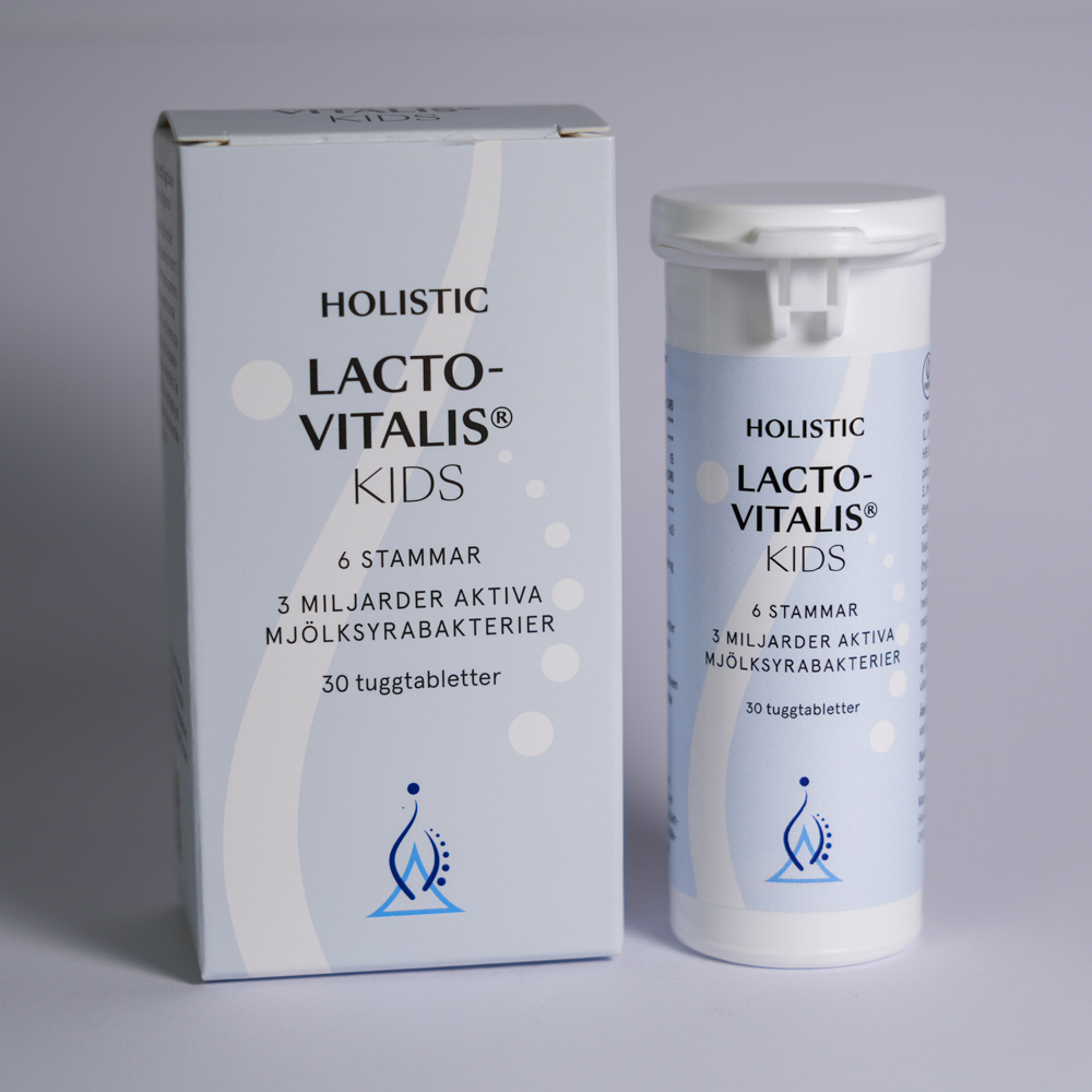 Holistic Lactovitalis® Kids är tuggbara kosttillskott i tabletter med frisk citronsmak, formulerade för att stödja barns tarmflora och immunförsvar. Varje tablett innehåller minst 3 miljarder CFU levande mjölksyrabakterier från 6 olika stammar, tillsammans med prebiotiskt FOS och 12 mg vitamin C.