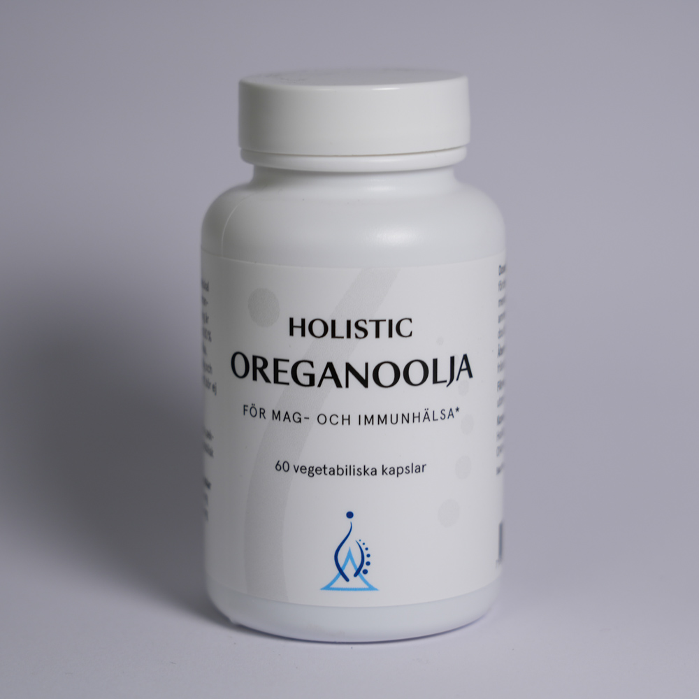 Holistic Oreganoolja är ett veganskt kosttillskott i kapselform som innehåller ekologisk oreganoolja med 80 % karvakrol. Oljan utvinns genom skonsam vattenångdestillation från ekologiskt odlade oreganobuskar. Varje kapsel innehåller 60 mg oreganoolja tillsammans med virgin olivolja. Kapslarna är utformade för långsam frisättning, vilket gör dem skonsamma för känsliga slemhinnor. Förpackningen innehåller 60 kapslar.