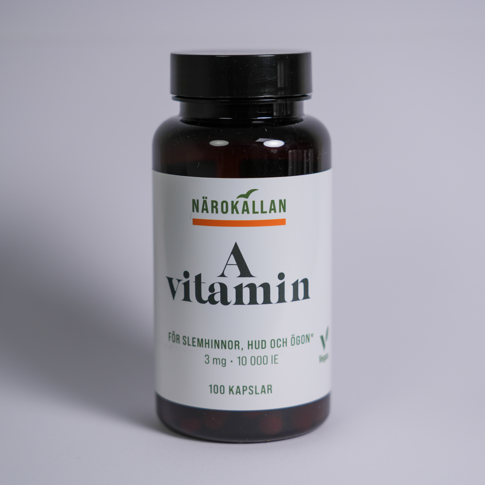 Närokällan A‑vitamin 100 kapslar är ett veganskt fettlösligt A‑vitamintillskott i form av retinylpalmitat, vilket tas upp direkt utan omvandling. Produkten stödjer immunsystemet, normal syn samt friska slemhinnor och hud.