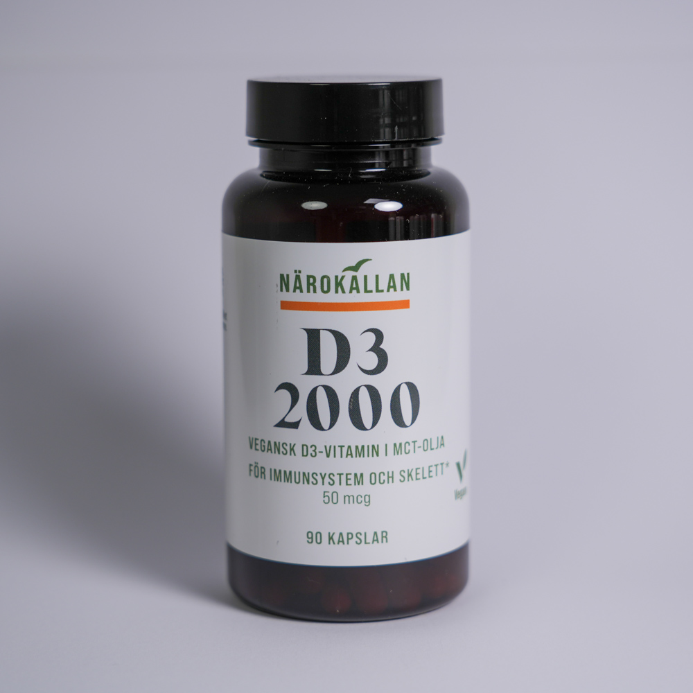 Närokällan D3 2000 Vegan är ett vegetariskt och veganskt D3-vitamin från alger, speciellt utformat för nordiskt klimat där solljus kan vara otillräckligt. Varje kapsel innehåller 50 µg (2000 IE) vitamin D₃ i oljepulverform (MCT-olja) för optimal upptagning. Produkten är fri från animaliska tillsatser, gluten och GMO. Förpackningen innehåller 90 kapslar.