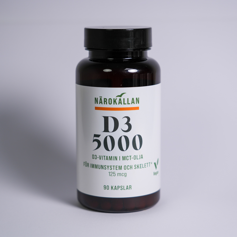 Närokällan D3 5000 Vegan, ett starkt vegetabiliskt D3-vitamin (kolekalciferol utvunnet från alg), särskilt lämpat för nordiskt klimat och mörka vintermånader. Produkten innehåller MCT-olja i pulverform (kokosolja + akaciagummi) för förbättrad fettlöslig upptagning av vitaminet. Förpackningen innehåller 90 vegetabiliska kapslar och är fri från animalier, gluten och GMO.