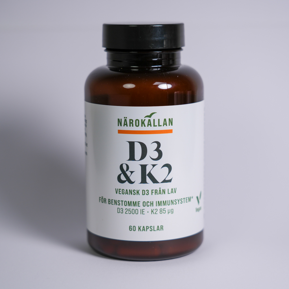 Närokällan D3 & K2 är ett veganskt kosttillskott med vegetabiliskt D3 (kolekalciferol från växtlav) och K2 (menakinon‑7) framtaget för att stödja optimal benhälsa, kalciumupptag och immunfunktion. Produkten är fri från gluten, soja och GMO.